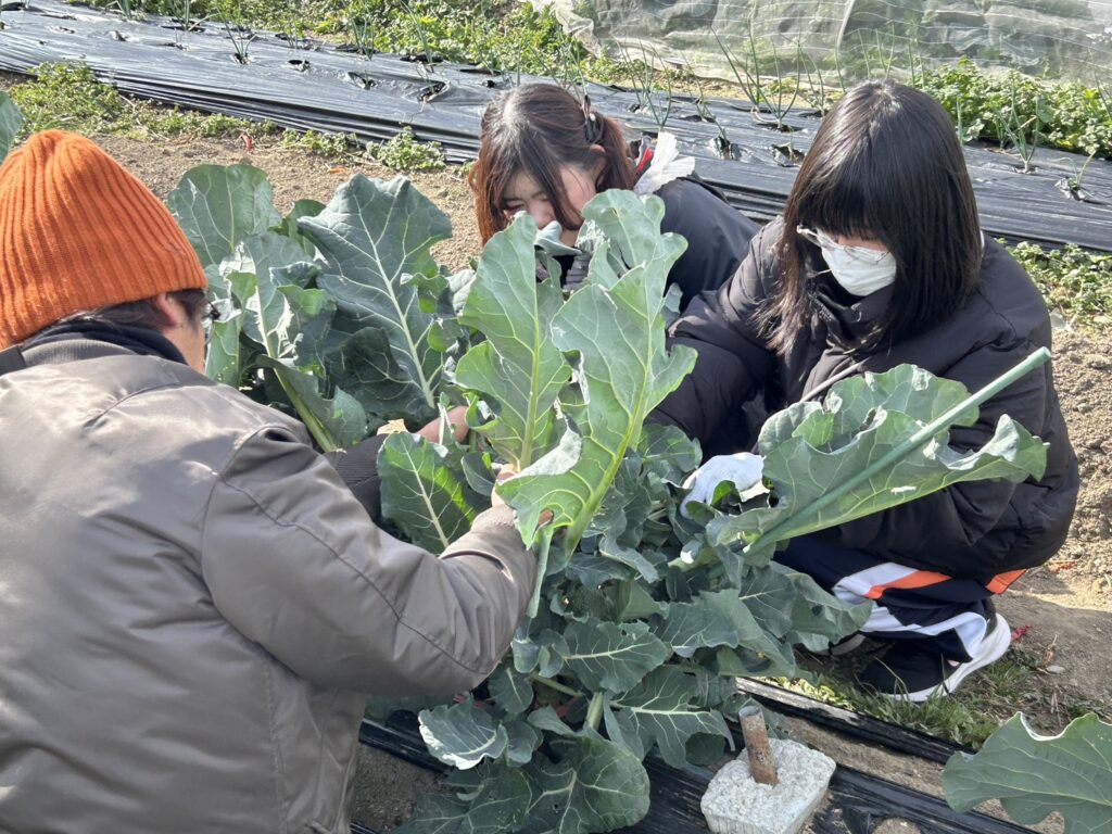 午前中は、ブロッコリーや大根、にんじんなどを収穫するチーム、畑を耕すチーム、収穫した野菜を調理用にカットするチーム、炭づくりをするチームに分かれて活動しました。